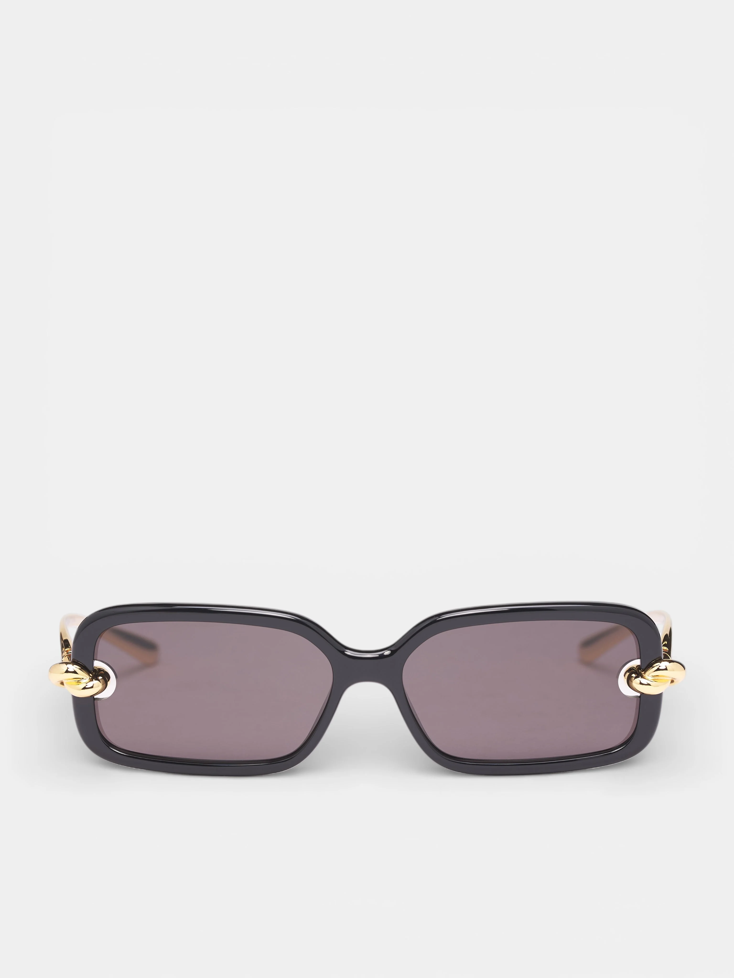 Rectangular sunglasses in black and gold constructed in polyamide with cutout lenses and signature knot detailing at the temples. Featuring: • Rectangular frame • Brown-tinted lenses • Lenses with cutouts highlighting knot detail • Metal temples with aerodynamic shape • Case included • Made in Japan • 100% Polyamide • One size