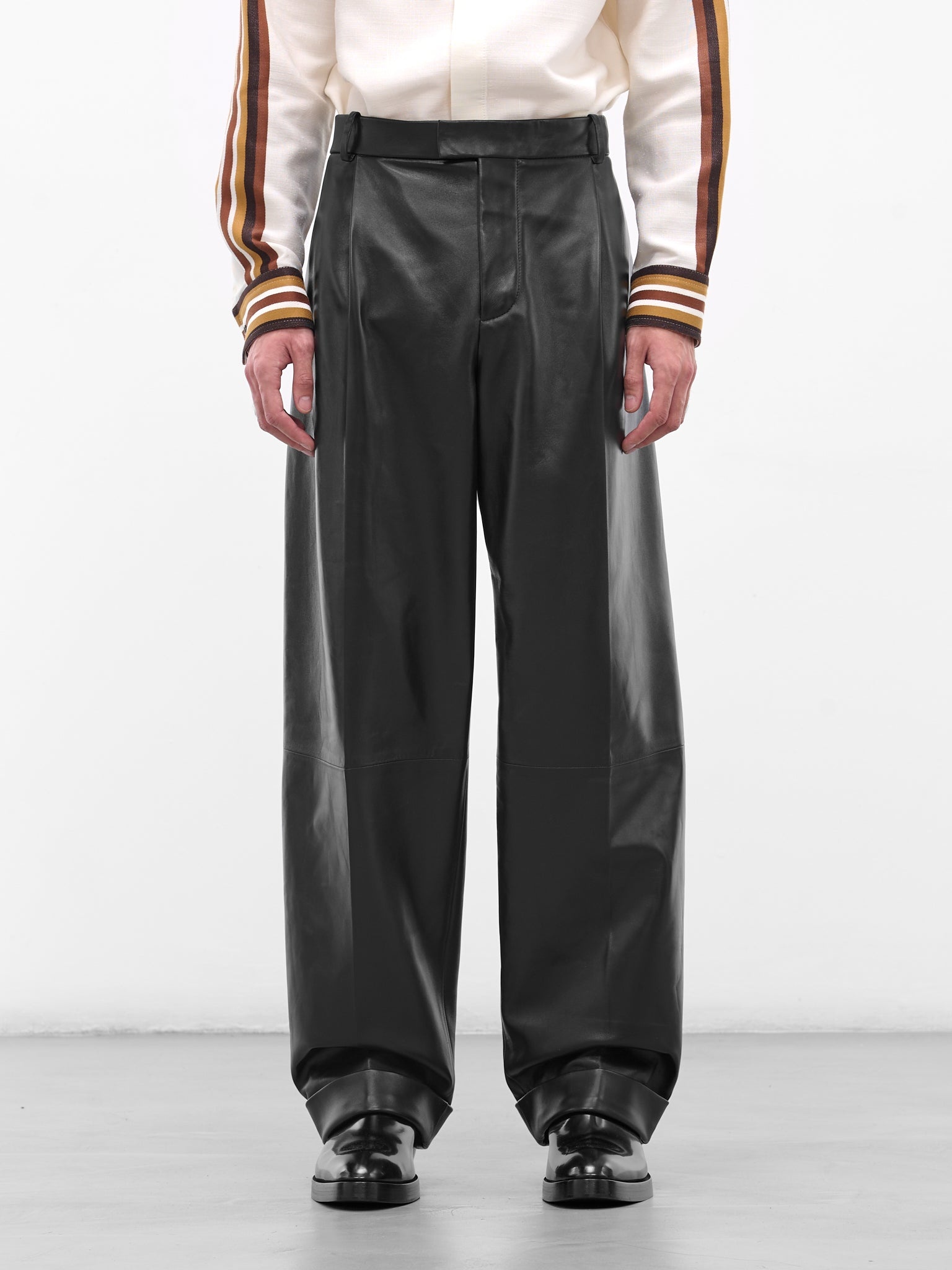 Bottega Veneta crafts these black pants in a soft, supple leather through their sophisticated, minimalist lens. Finished with a wide-leg cut, pleating, and turned-up cuffs. Obsessive detailing rendered with luxury materials, with a timeless silhouette. Featuring: • Tailored fit and wide leg • Paneled construction • Belt loops and concealed zip fly • Four-pocket styling and signature triangle • Pleating and traveler's crease • Turned-up cuffs • Made in Italy • 100% Leather • Italian sizing Model is 6'0" wearing size 48. Shoulders: 17" Chest: 30" Waist: 28"