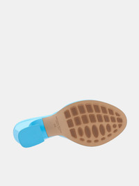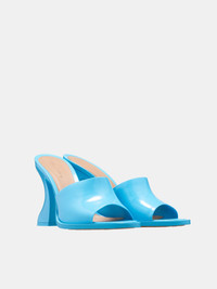 BOTTEGA VENETA heels in blue, mule design, paneled leather construction, slip-on style, open back, round open toe, modified heel, footbed & outsole branding, rubber-injected outsole. Made in Italy Outer: 100% Calfskin Inner: 100% Lambskin European Sizing