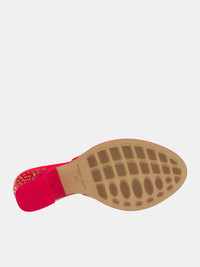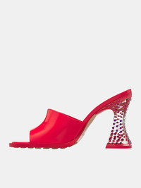 BOTTEGA VENETA heels in red, heeled, mule design, vinyl leather construction, glossy finish, slip-on style, open back, plexi sculptural heel, heel rhinestone embellishment, rounded open toe, debossed logo footbed & sole, rubber-injected leather sole, lambskin lining. Made in Italy Outer: 100% Vinyl Calfskin Inner: 100% Lambskin European Sizing