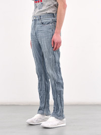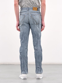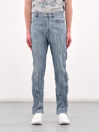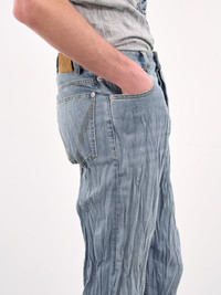 BOTTEGA VENETA jeans in blue, paneled denim construction, crushed denim effect, belt loops, back Intrecciato patch, front button & concealed zip fly closure, inset pockets, coin pocket, back patch pockets, tapered leg, slim fit. Made in Italy 100% Lambskin Italian Sizing Model is 6'1.5" wearing size 46. Shoulders: 18.5" Chest: 37" Waist: 31"
