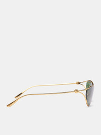 In a gold and green colorway, these Bottega Veneta sunglasses feature a sophisticated cat-eye silhouette. A signature trompe l'oeil Knot motif on the temples provides a sculptural, surrealist detail. Featuring: • Cat-eye silhouette • Semi-rimless edges • Signature trompe l'oeil knot motif at temples • Green-tinted lenses • Bio-based polyamide lens construction • Subtle logo engraving at temple tips • Case included • Made in Japan • Composition: 100% Metal • One size