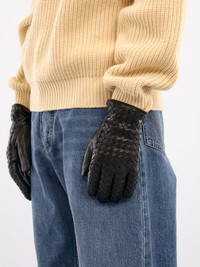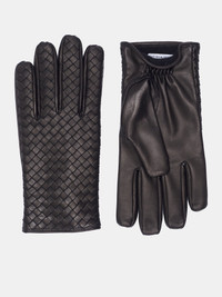 BOTTEGA VENETA gloves in black, five-finger design, lambskin construction, signature Intrecciato pattern, wrist cinching, cashmere lining. Made in Italy Outer: 100% Lambskin Inner: 100% Cashmere Glove Sizing