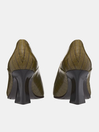 BOTTEGA VENETA shoes in olive, calfskin construction, crocodile embossed, low-top, slip-on style, sculptural sloped heels, elongated silhouette, pointed toe, leather sole, lambskin lining. Made in Italy Outer: 100% Calfskin Inner: 100% Lambskin European Sizing
