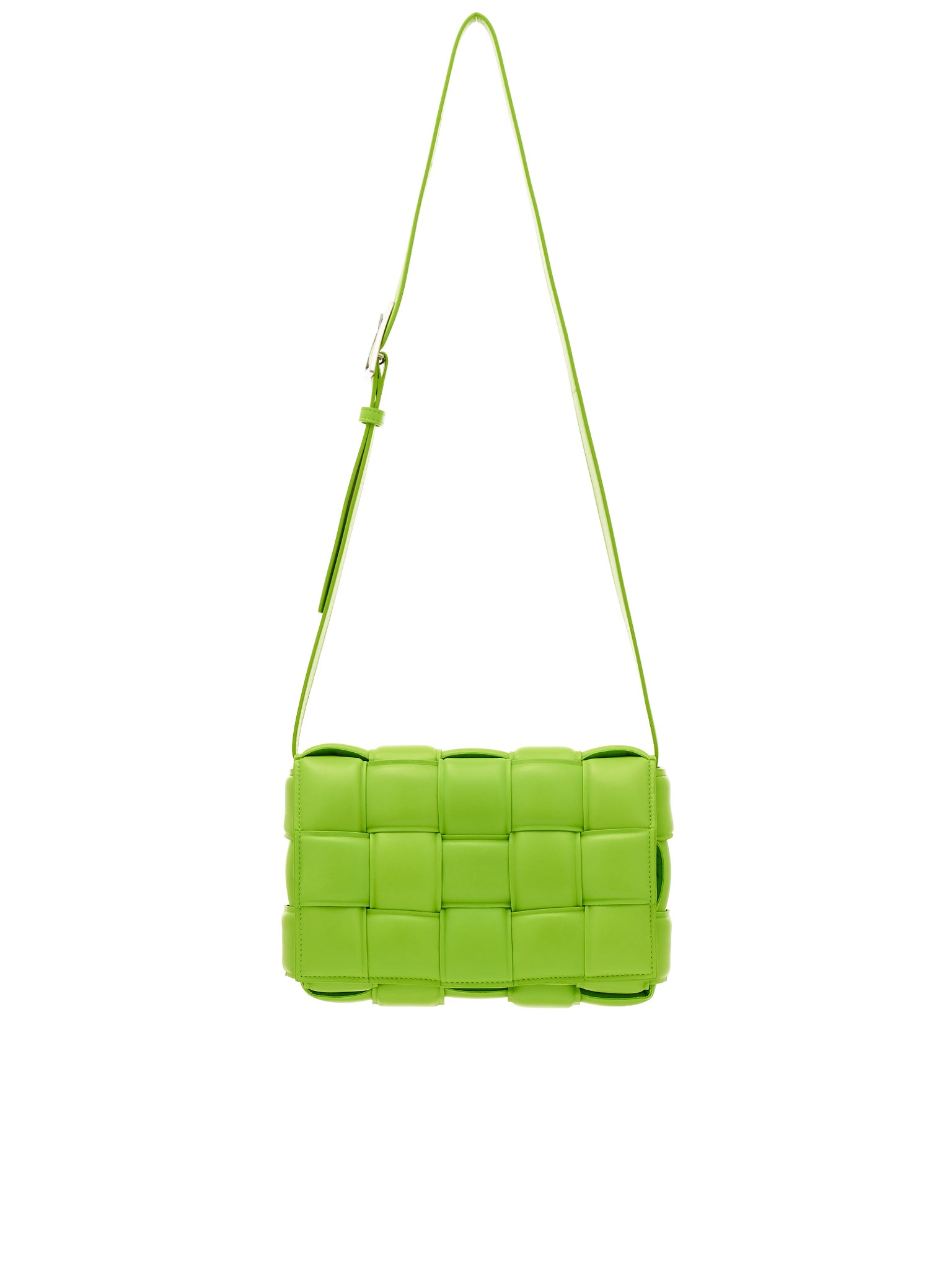 Bottega Veneta padded woven intrecciato leather cross-body bag in green, single main compartment with flap closure, interior zipped pocket, magnetic closure, adjustable shoulder strap, tonal stitching. Made in Italy. One size. Composition: 100% Leather