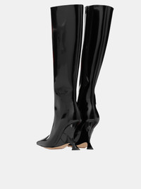 BOTTEGA VENETA black shoes, glossy calfskin construction, side zip closure, lacquered wedge, modified heel design, leather outsole, rubber tread, lambskin lining, knee-high. Made in Italy Outer: 100% Calfskin Inner: 100% Lambskin Italian Sizing