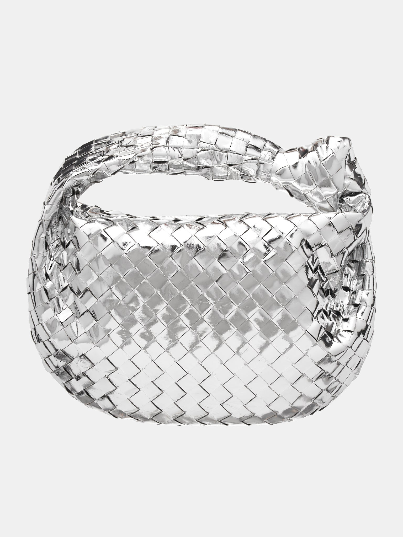 BOTTEGA VENETA bag in silver, metallic Intrecciato laminated leather design, knot top handle, single compartment, zip closure, silver finish hardware, calfskin lining. Made in Italy 100% Calfskin 18.9" H x 15.7" W x 6.1" D 11.8" Handle Drop