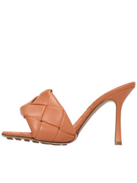 Bottega Veneta sandal in papaya, intrecciato nappa leather upper, square toe, rubber injected leather outsole, stiletto heel, tonal stitching. Made in Italy. European Sizing.