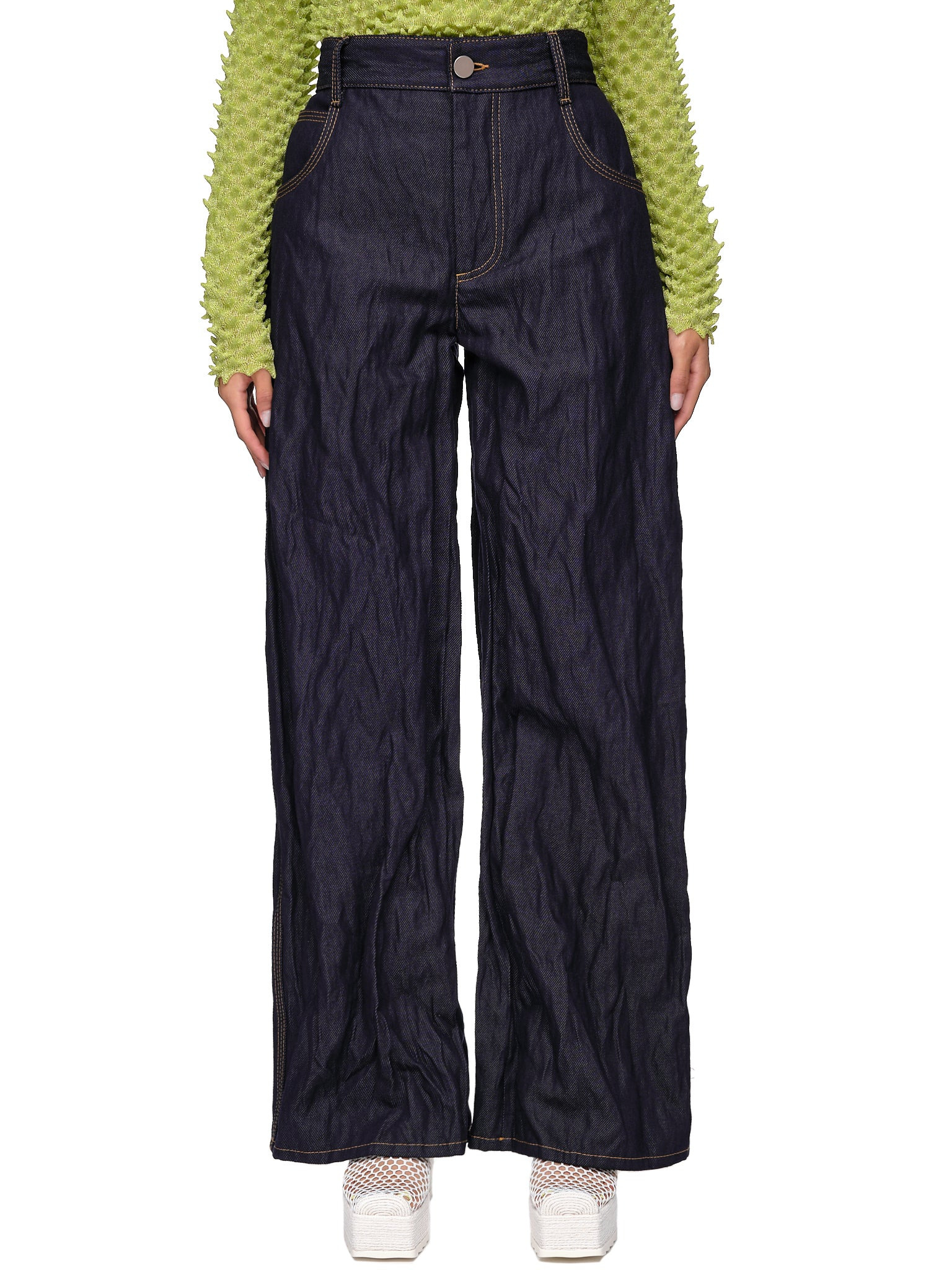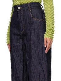 Bottega Veneta jeans in dark wash denim, high waisted, five pocket styling, striaght leg sihlouette. Made in Italy. Italian Sizing. Composition: 86% Cotton, 14% Metal Fiber. Model is 5'8" and wearing a size 38. Bust: 32" Waist: 25" Hip: 34"