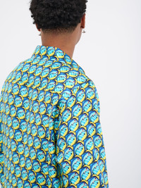 BOTTER shirt in blue, classic design, silk construction, fish print, pointed collar, long sleeves, button closure & cuffs, straight hem, regular fit. European Sizing 100% Silk Model is 6’1” wearing size 48. Shoulders: 19” Chest: 38” Waist: 30”