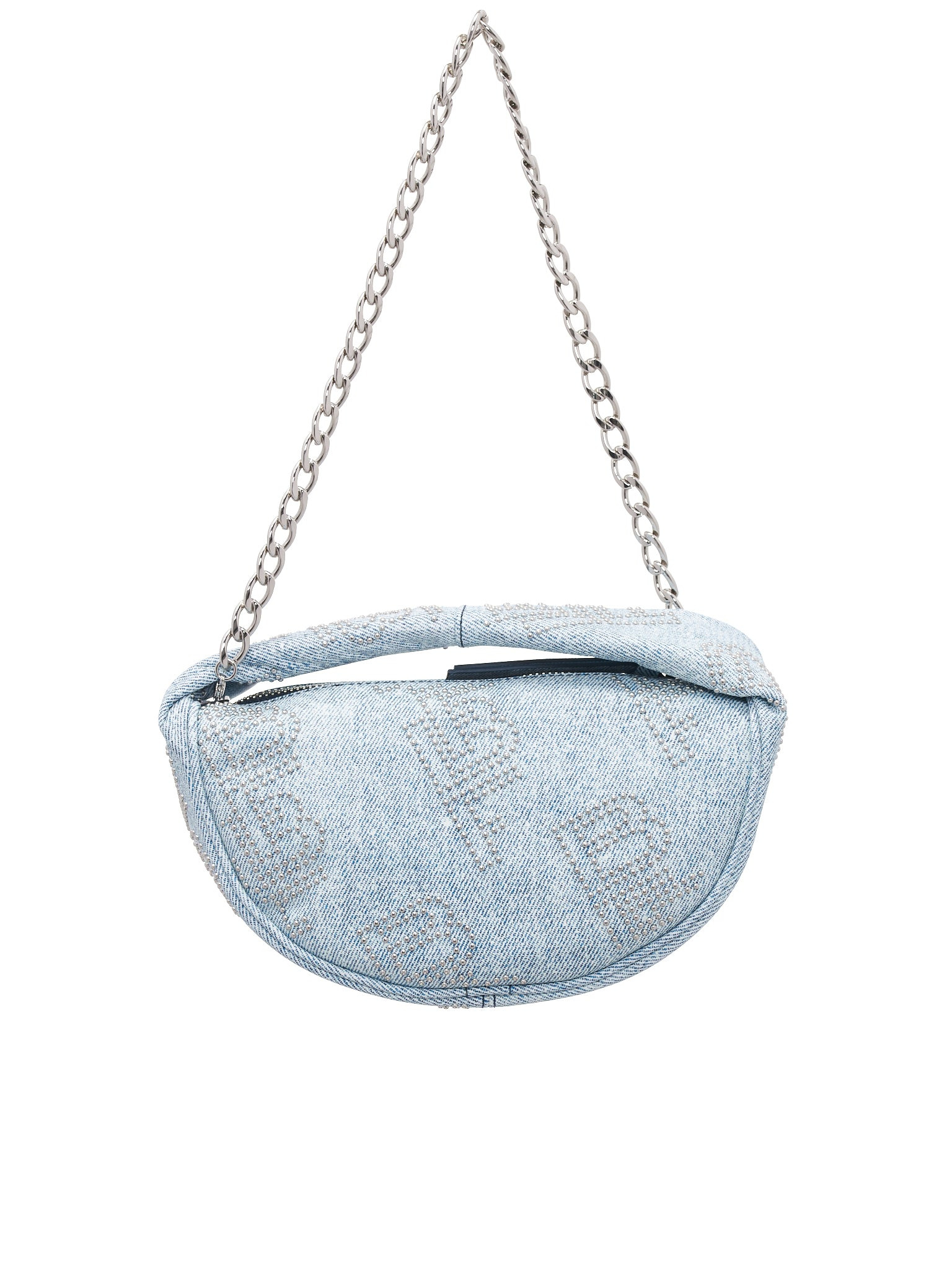 BY FAR bag light blue, denim with studded motif, soft rounded construction, top-handled, detachable chain strap, zip closure, silver-tone hardware, cotton lining. Made in Bulgaria 100% Cotton, Metal 3.1” Depth, 4.7” Height, 8.9” Width,18.5” Chain Length