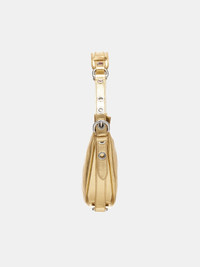 BY FAR bag in gold, shoulder design, crescent shape, metallic leather, adjustable handle, zip closure, logo detailing, silver-toned hardware, fully lined. Made in Bulgaria Exterior - 100% Leather Lining - 100% Cotton