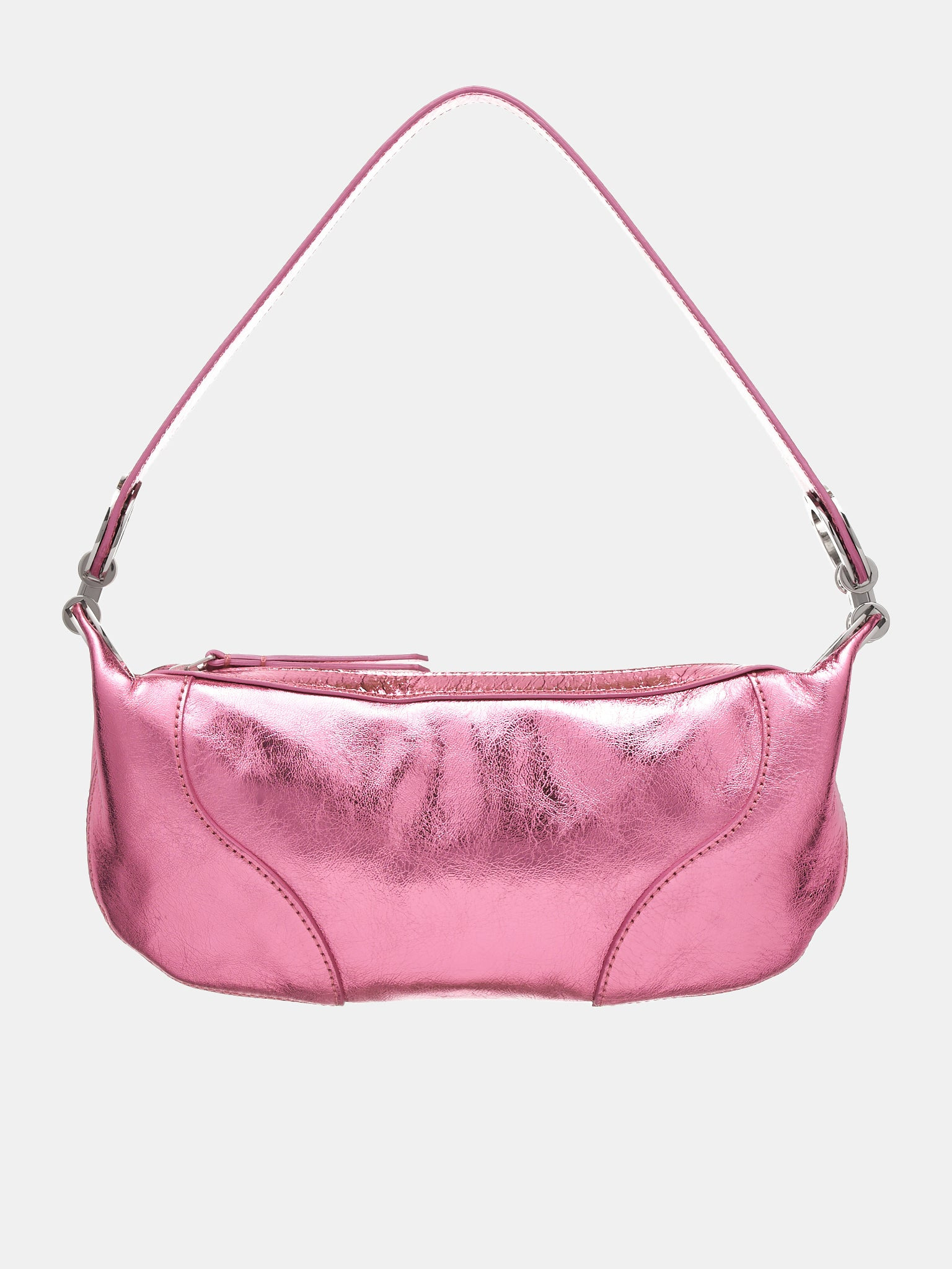 BY FAR bag in pink, rounded silhouette, metallic light grain cowhide leather, curved handle, zip closure, hand-applied matching enamel plating, branded silver-toned hardware, fully lined. Made in Bulgaria Main - 100% Cowhide Leather Lining - 100% Cotton 2.6" Depth, 5.5" Height, 11" Width, 18.9" Strap Length, 11.4" Strap Drop