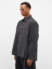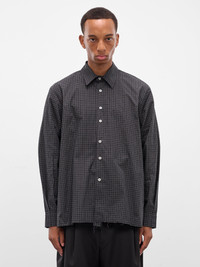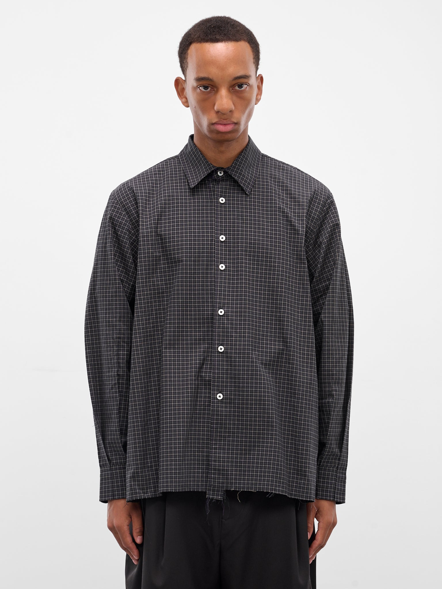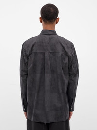 A black grid plaid cotton shirt with an oversized fit and back yoke pleating. The pointed collar and raw asymmetric hem add subtle structure to the relaxed silhouette. Featuring: • Oversized fit • Cotton construction • Grid plaid pattern • Pointed collar • Front button placket closure • Long sleeves with button cuffs • Back yoke pleating • Raw asymmetric hem • Made in Portugal • 100% Cotton • Standard sizing Model is 6'1" wearing size M. Shoulders: 19" Chest: 33.5" Waist: 27.5"