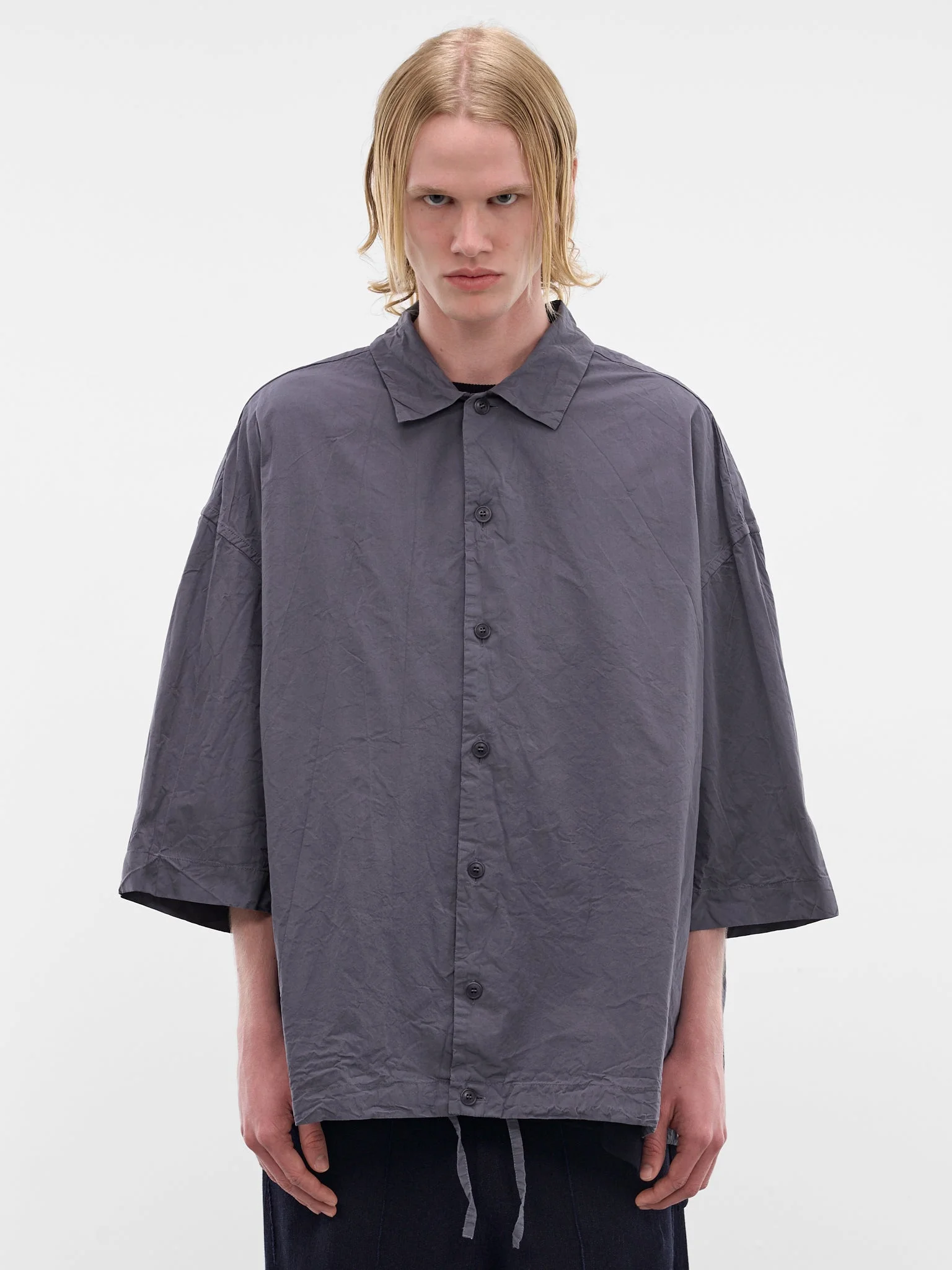 Volume shirt in gray constructed in cotton with a crinkled paper-effect texture and oversized boxy silhouette. Featuring: • Oversized boxy fit • Cotton construction • Crinkled paper-effect texture • Spread collar • Front button placket closure • Dropped shoulders • Short sleeves • Made in France • 100% Cotton • Standard sizing Model is 6'0" wearing size M. Shoulders: 19" Chest: 35" Waist: 28"