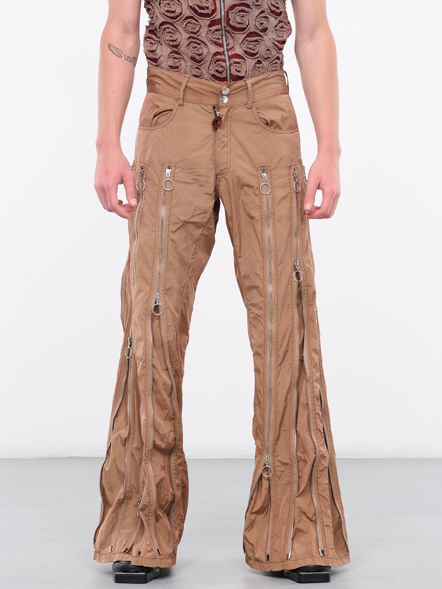 CHARLIE CONSTANTINOU brown pants, one-of-a-kind, adjustable width, deadstock nylon, garment-dyed, mid-waist, snap button & zip-fly, side pockets, multi-zip legs, regular fit. Made in UK 100% Nylon US Sizing Model is 6’1” wearing size 32. Shoulders: 19” Chest: 38” Waist: 31”
