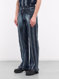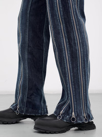 CHARLIE CONSTANTINOU pants in indigo, paneled denim construction, faded & washed, belt loops, front button & concealed zip fly closure, inset pockets, all-over adjustable zip vents, straight leg, regular fit. Standard Sizing Model is 6'2" wearing size 30. Shoulders: 19" Chest: 38" Waist: 31"