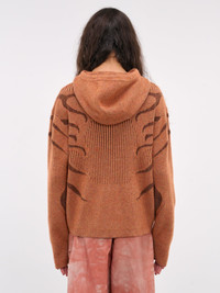 CHARLIE CONSTANTINOU hoodie in orange & brown, paneled knit construction, graphic jacquard knit pattern, rib-knit, hood, adjustable drawstring, long sleeves, thumbholes, straight hem, relaxed fit. Standard Sizing Model is 5'11.5" wearing size M. Shoulders: 18" Chest: 36" Waist: 30"