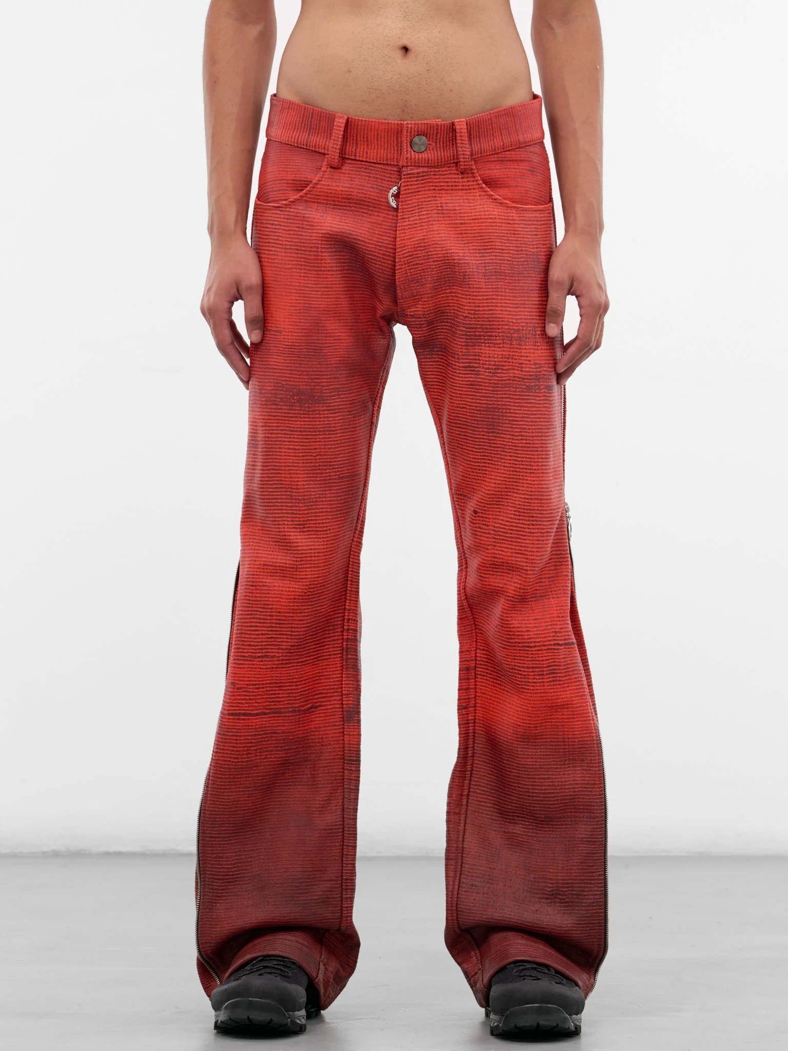 Featuring: • Slim fit • Flared leg • Striped and gradient pattern • Belt loops • Front button and zip fly closure • Logo-engraved signature zip pull • Inset pockets • Zip vents at sides and back • Made in UK • Silk and Leather • Standard sizing Model is 6'1" wearing size 32. Shoulders: 19" Chest: 38" Waist: 28"