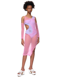 Chet Lo swimsuit in lilac, asymmetric collar, single sleeve design, side cutout construction, one piece silhouette. Made in London. U.K. Sizing. Model is 5ft 8” and is wearing a size 8. Bust: 32” Waist: 24” Hip: 35"