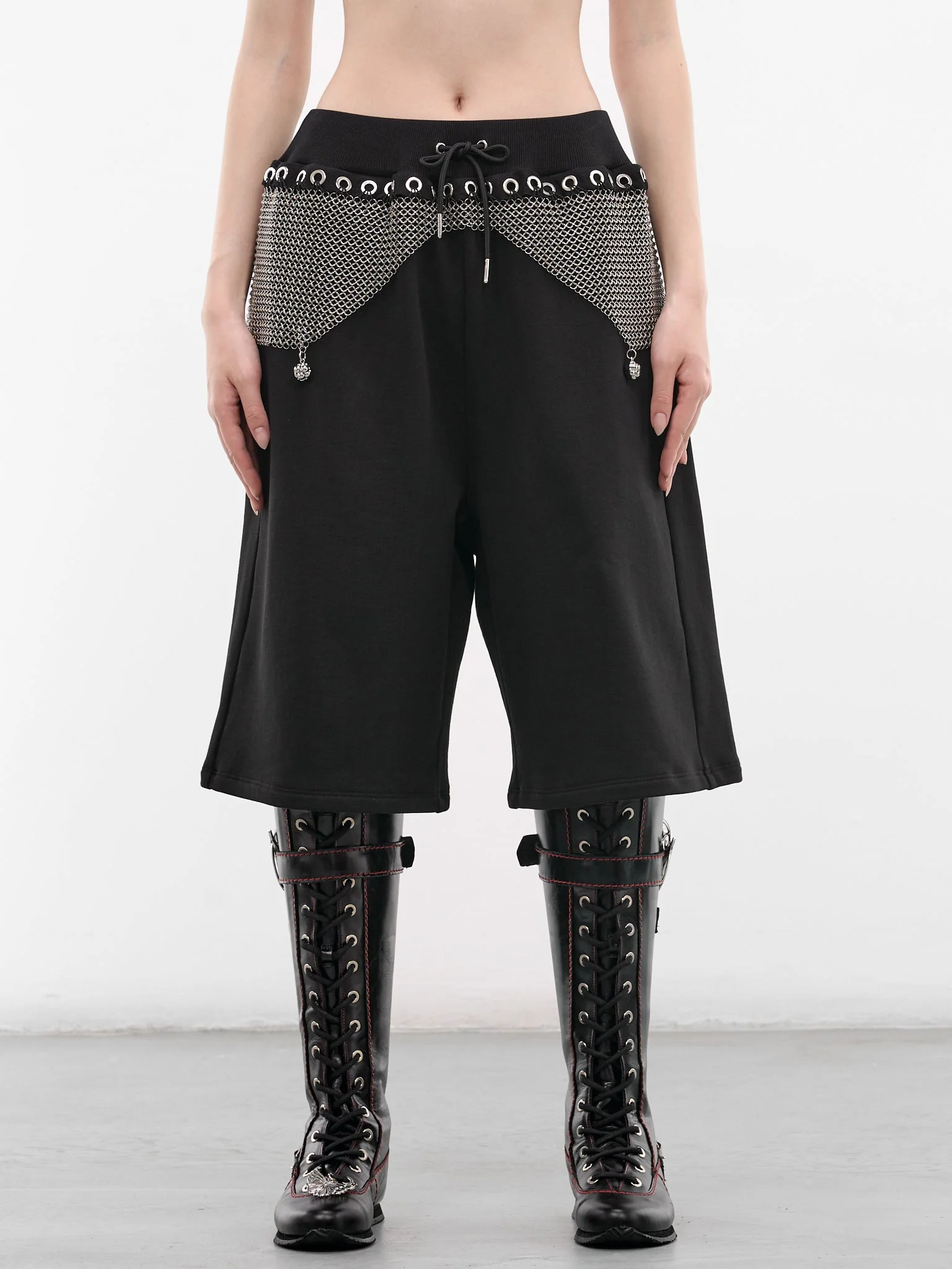 Titan chainmail shorts in black cut from cotton with eyelets and chainmail embellishment. Featuring: • Baggy fit • High waist • Rib-knit waistband with drawstring • Eyelets and chainmail embellishment • Circular charms • Side pockets • Below-knee length • Wide leg • Made in Bulgaria • Main: 100% Cotton | Secondary: 100% Stainless Steel • Standard sizing Model is 5'7" wearing size S. Bust: 30" Waist: 24" Hips: 35"