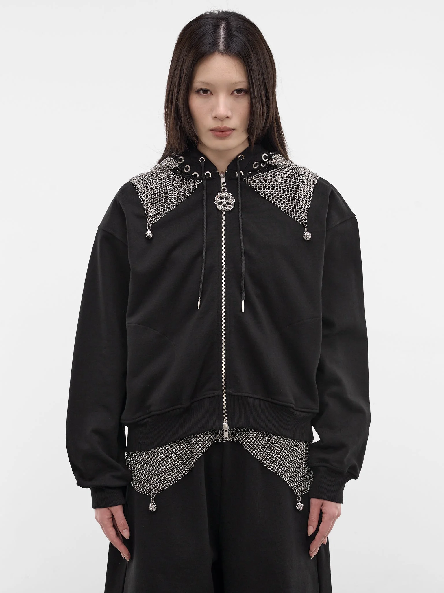 Titan chainmail hoodie in black and silver crafted from cotton with chainmail trim and circular charm detailing. Featuring: • Relaxed fit • Cotton construction • Hood with adjustable drawstring • Eyelets and chainmail trim • Circular charm detail • Dropped shoulders • Long sleeves • Rib-knit cuffs and hem • Two-way zip closure with organic-shaped zip pull • Side pockets • Made in Bulgaria • Main: 100% Cotton | Secondary: 100% Stainless Steel | Rib: 98% Cotton 2% Elastane • Standard sizing Model is 5'7" wearing size S. Bust: 30" Waist: 24" Hips: 35"