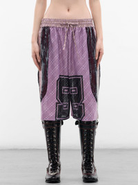 Basketball shorts in pink crafted from net mesh and cotton with plaid pattern and basketball graphics. Featuring: • Baggy fit • Net mesh and cotton construction • Plaid pattern • Basketball graphics • Contrast paneling • Elasticated waistband with drawstring • Side pockets • Below-knee length • Wide leg • Made in Bulgaria • Main: 100% Polyester | Secondary: 72% Cotton 28% Linen | Tertiary: 60% Acetate 40% Viscose • Standard sizing Model is 5'7" wearing size S. Bust: 30" Waist: 24" Hips: 35"