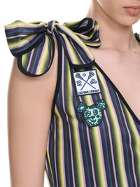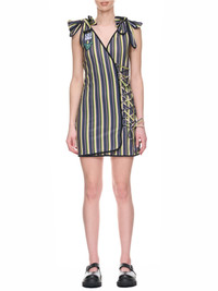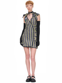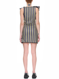 CHOPOVA LOWENA dress in multicolor, wrap layered design, stretch jersey, stripe pattern, graphic artwork, plunging y-neck, tie shoulder straps, armsyces, cut-outs & lace-up detailing, silver-tone hardware, mini length, slim fit. Made in Bulgaria Standard Sizing 96% Polyester, 4% Elastane Model is 5'10" wearing size XS. Bust: 28.5" Waist: 22" Hip: 34.5"