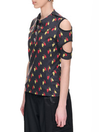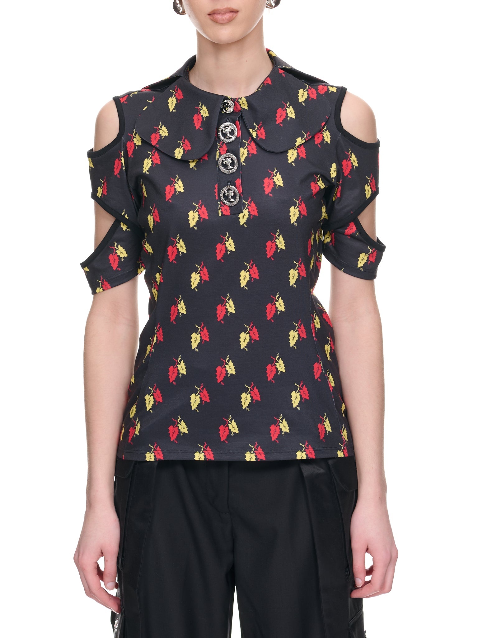 CHOPOVA LOWENA shirt in black, paneled design, stretch jersey, organic cotton poplin, jacquard pattern, modified peter pan collar, logo engraved graphic button closure, sleeve cut-outs, silver-tone hardware, slim fit. Made in Bulgaria Standard Sizing Body - 96% Polyester, 4% Elastane Second - 100% Organic Cotton Model is 5'10" wearing size S. Bust: 28.5" Waist: 22" Hip: 34.5"
