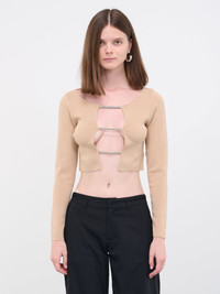 CHRISTOPHER ESBER top in beige, stretch luxe compact rib knit, chest lattice crystal detailing, multi-wear, scoop neckline, long sleeves, mid-weight, cropped, slim fit. Standard Sizing 80% Viscose, 20% Nylon, Crystal Model is 5'10" wearing size XS. Bust: 32" Waist: 24" Hips: 35"