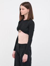 CHRISTOPHER ESBER t-shirt in black, luxe compact rib knit, center brass armateur, quartz stone, round neck, long sleeves, cropped, slim fit, true to size. UK Sizing 96% Polyester, 2% Spandex, Natural Stone Model is 5'10" wearing size 6. Bust: 32" Waist: 24" Hips: 35"