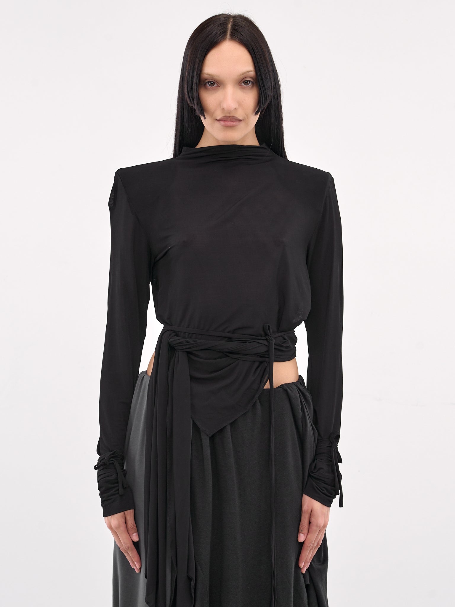 CHRISTOPHER ESBER blouse in black, paneled construction, high neck, structured shoulders, long sleeves, self-tie cuffs, bodice draping & wrap-around self-tie fastening, extended draping, asymmetric hem, cropped length, tailored fit. UK Sizing Model is 5'8" wearing size 6. Bust: 32" Waist: 26" Hips: 34.5"