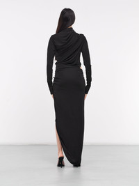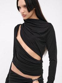 CHRISTOPHER ESBER dress in black, paneled viscose construction, draped throughout, front cut-outs, high neck, elongated sleeves, hip adjustable pin-buckle leather strap, leg slit, asymmetric hem, maxi-length, slim fit. Made in India Fabric 1: 100% Viscose Fabric 2: 100% Calf Leather Australian Sizing Model is 5'8" wearing size 8. Bust: 32" Waist: 26" Hips: 34.5"