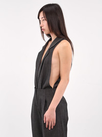 CHRISTOPHER ESBER bodysuit in black, paneled construction, v-neckline, halterneck, peaked lapel, sleeveless, armscyes, relaxed fit. UK Sizing Model is 5'8.5" wearing size S. Bust: 32" Waist: 25" Hips: 35"