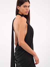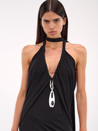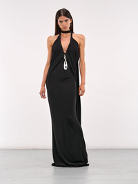 CHRISTOPHER ESBER dress in black, paneled viscose construction, halterneck & twisted straps, self-tie fastening & extended draping, plunged neckline, neckline ruching & gathering, long sleeves, front layering & draping, front brass & natural stone embellishment, straight hem, floor-length, relaxed fit. Made in India Main: 100% Viscose Hardware: 100% Brass UK Sizing Model is 5'8" wearing size 6. Bust: 32.5" Waist: 24" Hips: 34"