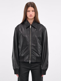 CHRISTOPHER ESBER jacket in black, paneled lambskin construction, spread collar, front exposed two-way zip closure, long sleeves, rib-knit cuffs & hem, front press-stud detailing, side welt pockets, straight hem, lined, relaxed fit. Made in India Outer: 100% Lambskin Ribbing: 100% Cotton Inner: 100% Cupro UK Sizing Model is 5'9" wearing size 8. Bust: 33.5" Waist: 25" Hips: 35"