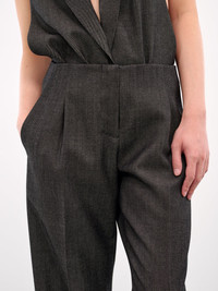 CHRISTOPHER ESBER pants in black, paneled construction, low waist, front concealed zip fly closure, pleated, side pockets, back welt pocket, traveler's crease, tapered leg, tailored fit. UK Sizing Model is 5'8.5" wearing size S. Bust: 32" Waist: 25" Hips: 35"