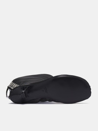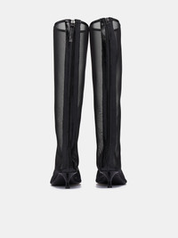CHRISTOPHER ESBER boots in black, mesh nylon knit construction, sheer, calf-high, back zip closure, leather trim, round toe, kitten heel, leather footbed & sole. Made in Italy Upper: 100% Nylon Trim: 100% Calf Leather Sole: 100% Calf Leather European Sizing