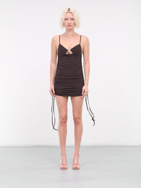 CHRISTOPHER ESBER dress in brown, stretch nylon construction, ruching throughout, v-neckline, spaghetti straps, sleeveless, signature zinc hardware, citrine quartz & tiger stone embellishment, bust cut-out, hem self-tie detailing, curved hem, mini-length, slim fit. Fabric: 72% Polyamide 28% Elastane Application: 100% Zinc Alloy & 100% Natural Stone UK Sizing Model is 5'9" wearing size 6. Bust: 32" Waist: 24" Hips: 34"