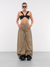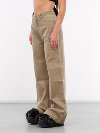 CHRISTOPHER ESBER jeans in olive, paneled denim construction, high waist, belt loops, front button & concealed zip fly closure, inset pockets, coin pocket, back patch pockets, wide leg, baggy fit. Made in India 100% Cotton UK Sizing Model is 5'10" wearing size 6. Bust: 33" Waist: 23.5" Hips: 35.5"
