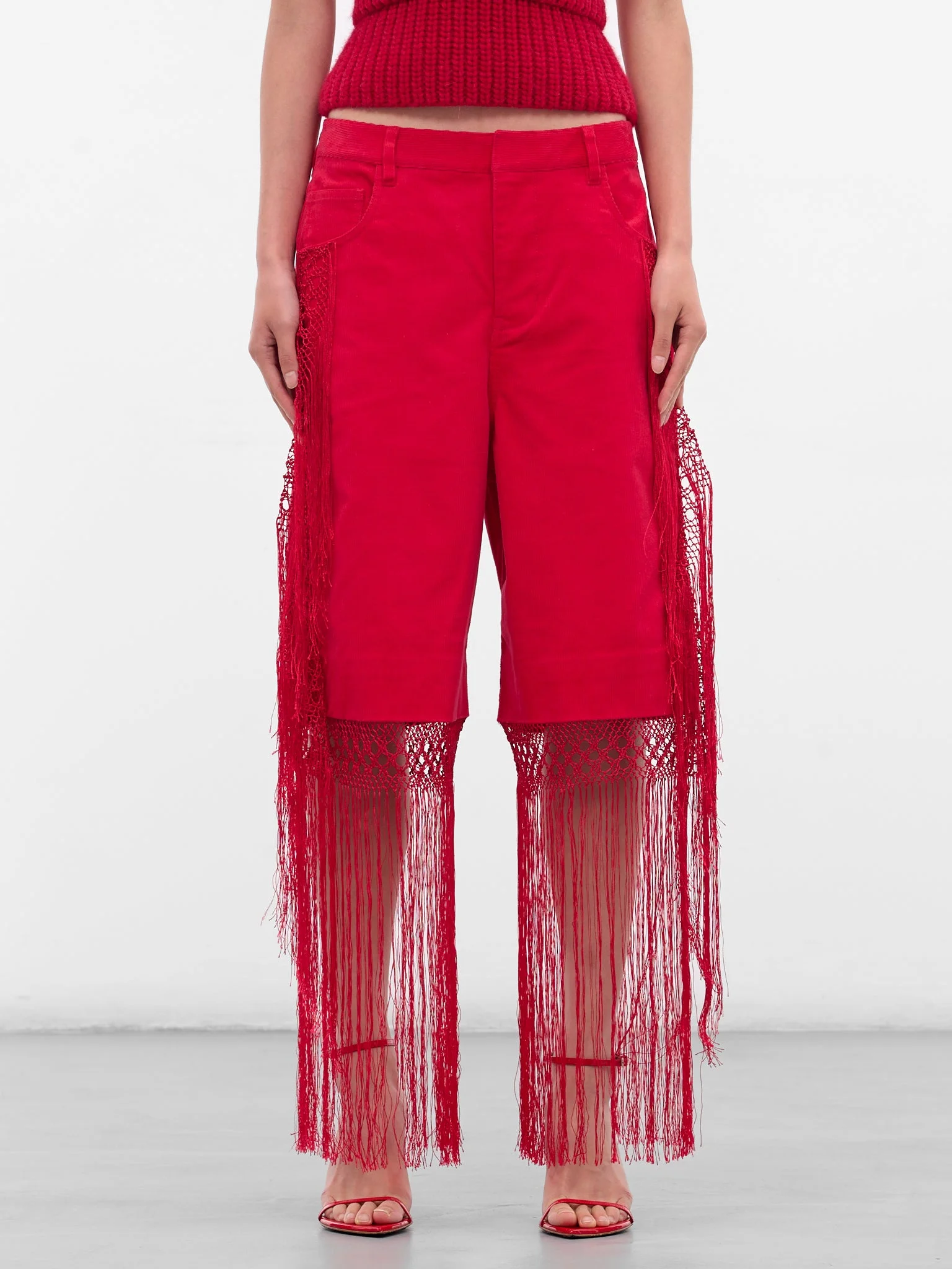 Featuring: • Relaxed wide-leg fit • Corduroy construction • Sheer macrame lace inserts with extended fringe • Five-pocket styling • Mid-rise waistband • Zip fly closure • Main: 98% Cotton 2% Spandex | Contrast: 100% Viscose • AU sizing Model is 5'10" wearing size 8. Bust: 31” Waist: 22” Hips: 33”