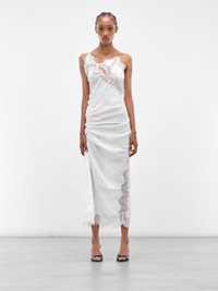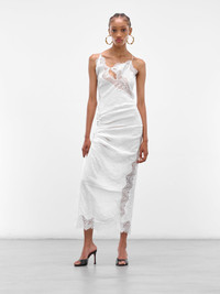 In a greyish-white, this midi dress juxtaposes crinkled crepe with sheer lace for a dramatic play of texture. Signature cut-outs, asymmetry, and a gathered front amplify its unique allure. Featuring: • Slim fit • Crinkled crepe body with sheer lace trim • Signature cut-outs framed by lace panels • Gathered front detail for subtle shaping • Adjustable tie fastening at back • Midi length hemline • Made in China • Main: 100% Viscose | Lace: 65% Polyamide 20% Polyester 15% Elastane • Australian sizing Model is 5'9.5" wearing size 6. Bust: 30" Waist: 23" Hips: 33"