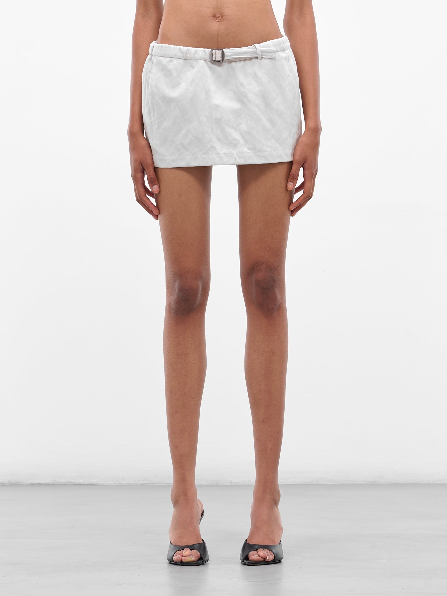 Finished in crushed 'cloud' white cotton, this micro/mini skirt sits low on the hips, its fine belt and tiny buckle hardware emphasizing the waist. Infused with metal yarns, the fabric keeps its sculptural, crumpled texture. Featuring: • Low-rise slim fit • Crushed cotton infused with fine metal yarns • Fine belt detailing with small buckle fastening • Micro length cut • Made in China • Shell: 68% Cotton 32% Metal | Contrast: 100% Cotton | Hardware: 100% Brass • Australian sizing Model is 5'9.5" wearing size 6. Bust: 30" Waist: 23" Hips: 33"