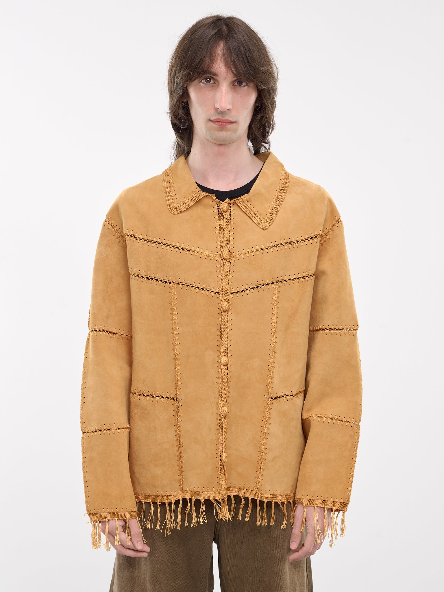 CMMN SWDN jacket in camel, paneled goat suede leather construction, crochet paneling throughout, spread collar, front buttoned placket closure, long sleeves, cuffs & hem fringing, straight hem, relaxed fit. Made in India 100% Goat Leather European Sizing Model is 6'1" wearing size 50. Shoulders: 17" Chest: 34" Waist: 28.5"