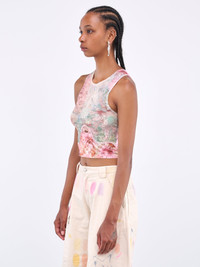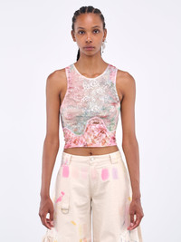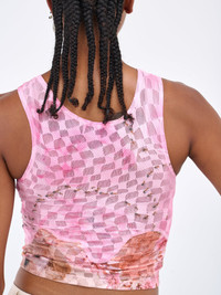 COLLINA STRADA top in pink, front or back wear, tank design, paneled construction, checkered mesh & lace, round neck, slight crop, fitted. Made in USA Standard Sizing 95% Polyester, %% Spandex Model is 5'10" wearing size XS. Bust: 32" Waist: 27" Hips: 34"