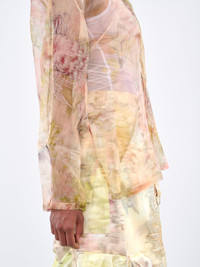 COLLINA STRADA shirt in yellow, oversized silhouette, semi-sheer, custom print, round neck, hidden button placket, dolman sleeves, relaxed fit. Made in USA Standard Sizing 100% Silk Model is 5'10" wearing size S. Bust: 32" Waist: 27" Hips: 34"