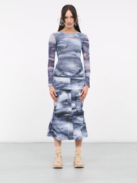 COLLINA STRADA blue skirt, signature "Rose Sylk" & cotton construction, all-over dolphin print, low-rise, dipped waistline, belt loops, mini-skirt overlay, button & concealed zip closure, inset pockets, back patch pockets, fishtail cut, slim fit. Made in New York Fabric 1: 100% Cotton Fabric 2: 100% Rose Sylk (cellulose fiber from rose bushes & stems) Standard Sizing Model is 5'8" wearing size S. Bust: 32" Waist: 26" Hips: 34.5"