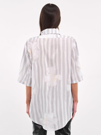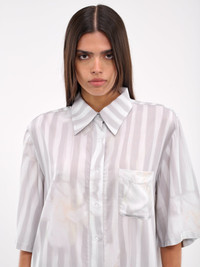 COLLINA STRADA shirt in grey, paneled rose sylk construction, stripe pattern, pointed collar, front button placket closure, short sleeves, chest patch pocket, shirttail hem, oversized fit. Made in US 100% Rose Sylk Organic Cellulose Fiber Standard Sizing Model is 5'8" wearing size S. Bust: 32.5" Waist: 24" Hips: 34"