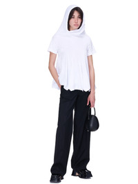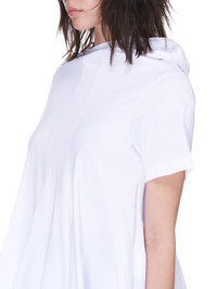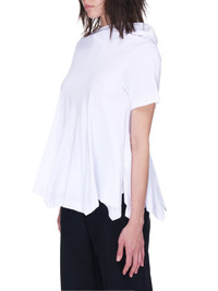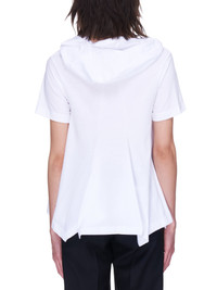 Comme des Garçons top in white, attached hood, short sleeves, a-line silhouette, ruffled skirting, finished hem, tonal stitching. Made in Japan. Standard S-L sizing. Composition - 100% Cotton. Model Measurements: Model is 5ft 7” and wearing a size S. Bust: 32” Waist: 24” Hip: 33"