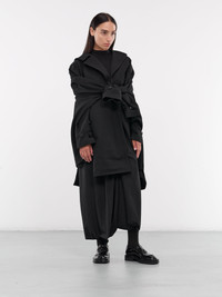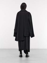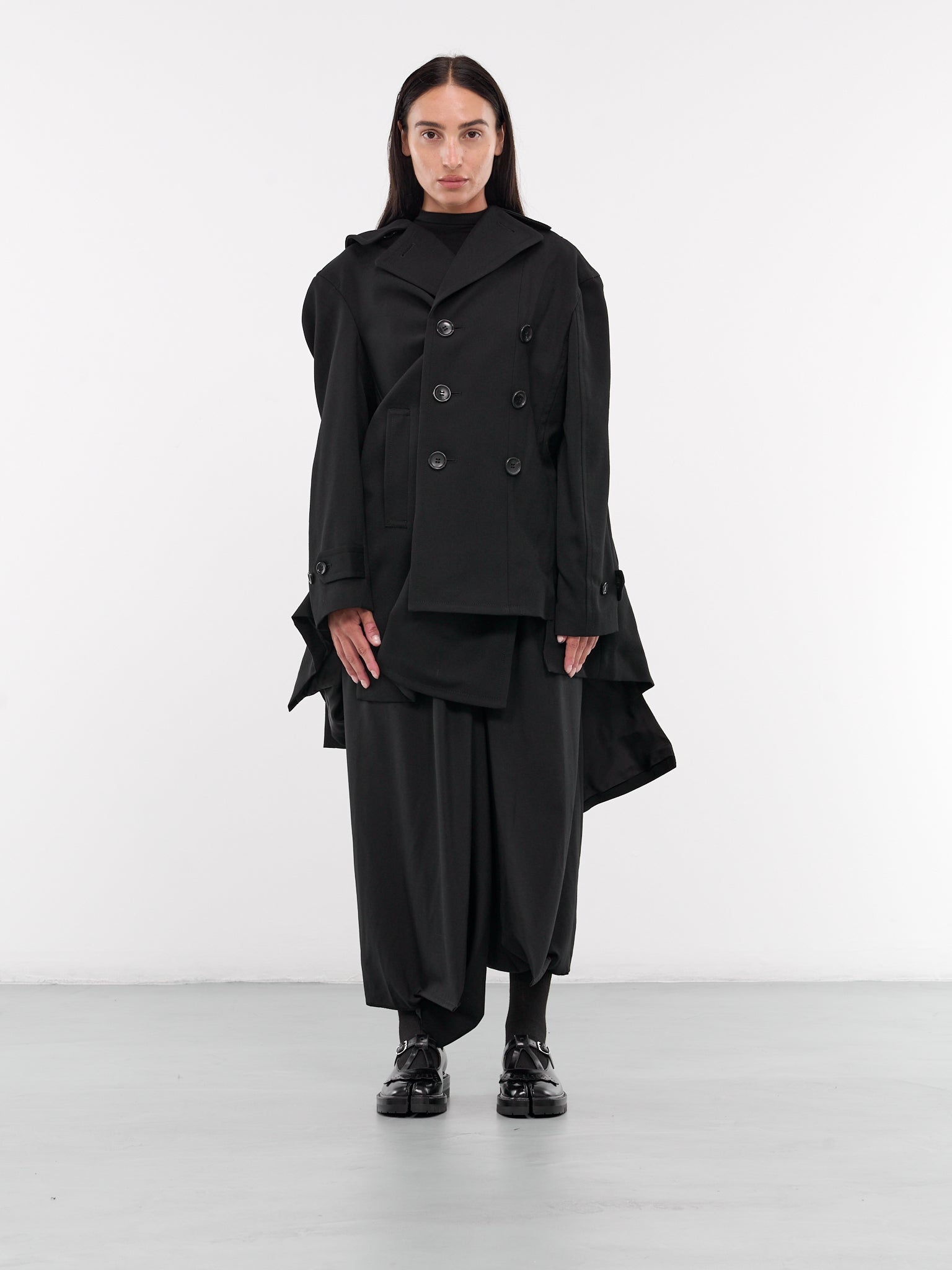 COMME DES GARCONS coat in black, paneled wool construction, notched lapel, double-breasted button closure, long sleeves, cuff adjustable button straps, back layered draping, side welt pockets, asymmetric hem, oversized fit. Made in Japan 100% Wool Standard Sizing Model is 5'6" wearing size S. Bust: 31" Waist: 24" Hips: 34"